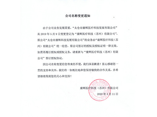 由于公司業(yè)務(wù)發(fā)展需要,“太倉市康輝醫(yī)療科技發(fā)展有限公司”從2019年5月9日變更登記為“康輝醫(yī)療科技(蘇州)有限公司”。